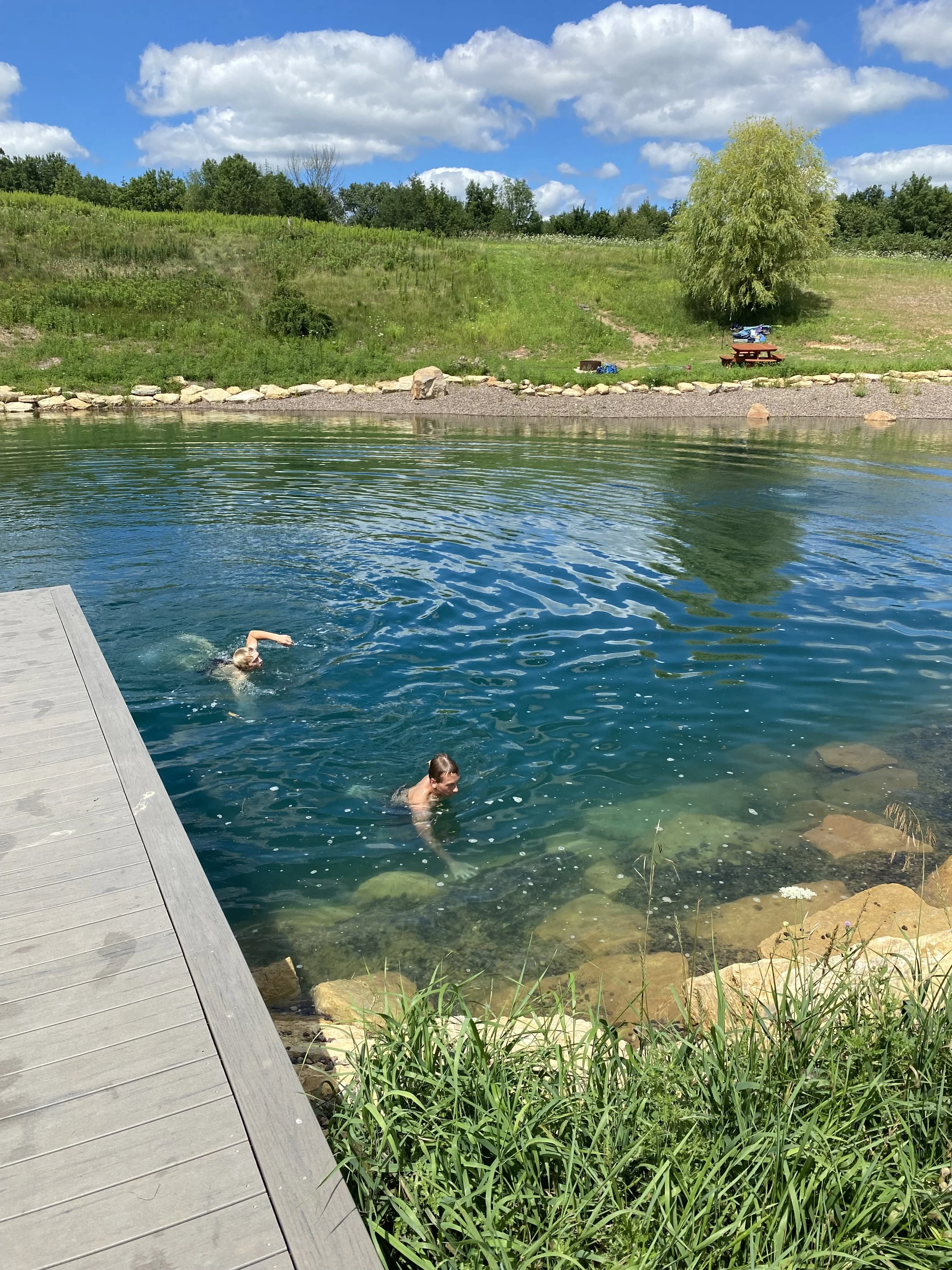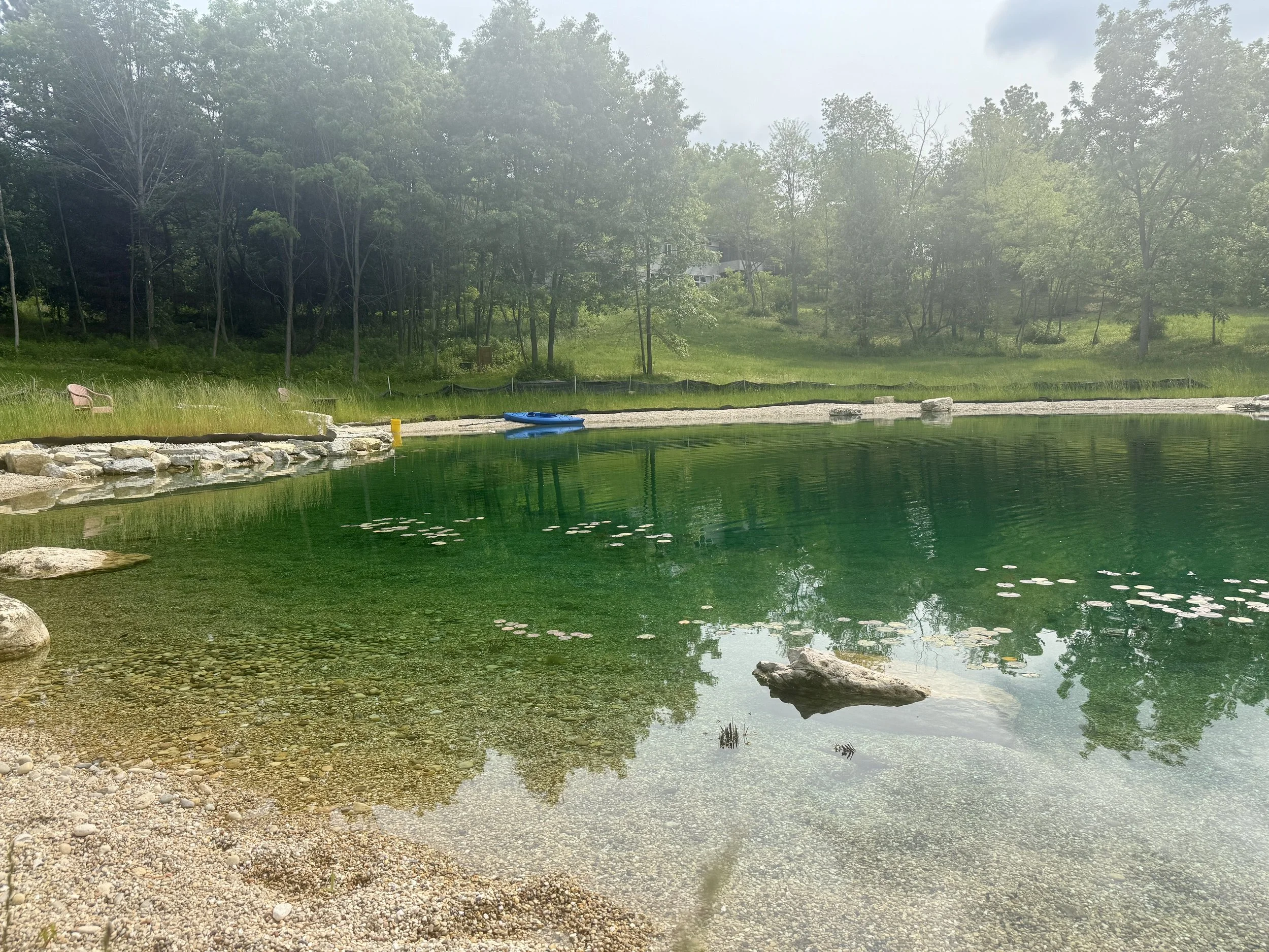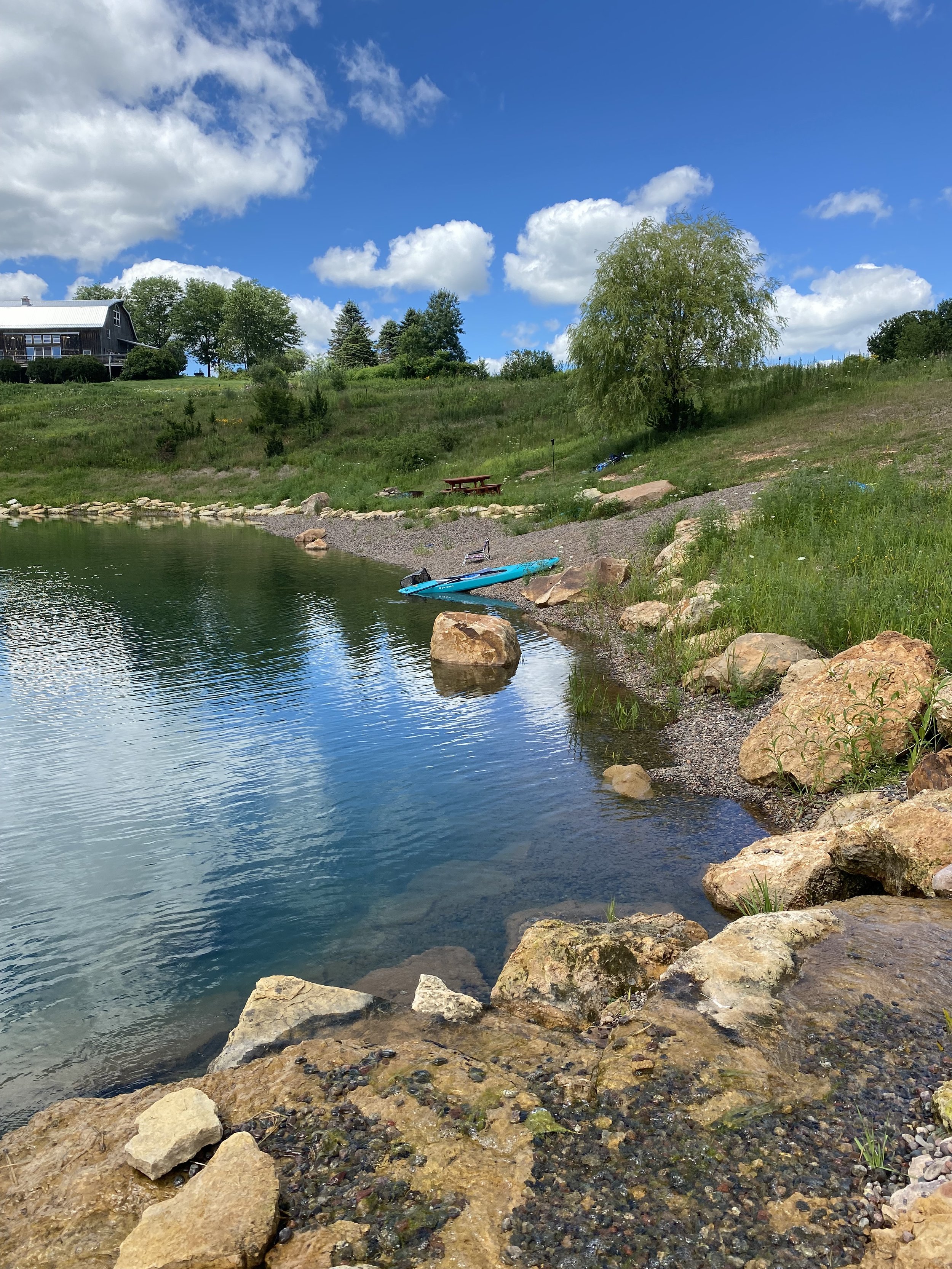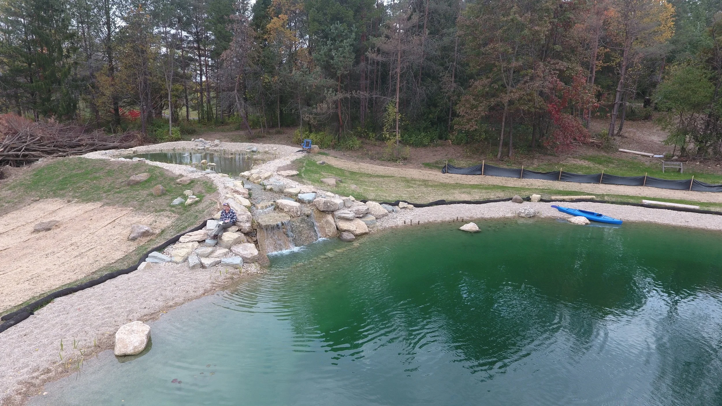 Pond enlarged for geothermal sizing, swimming and kayaking.