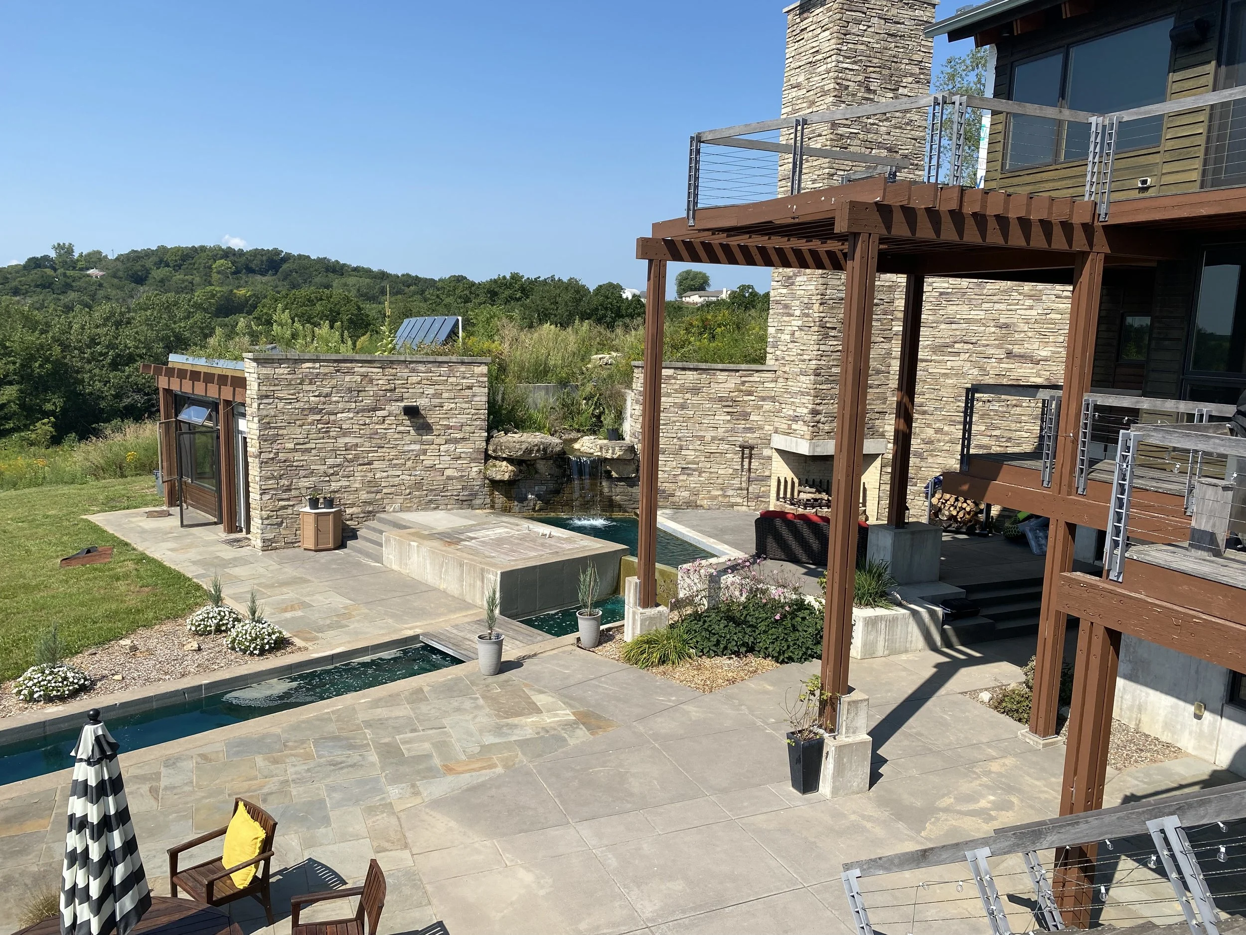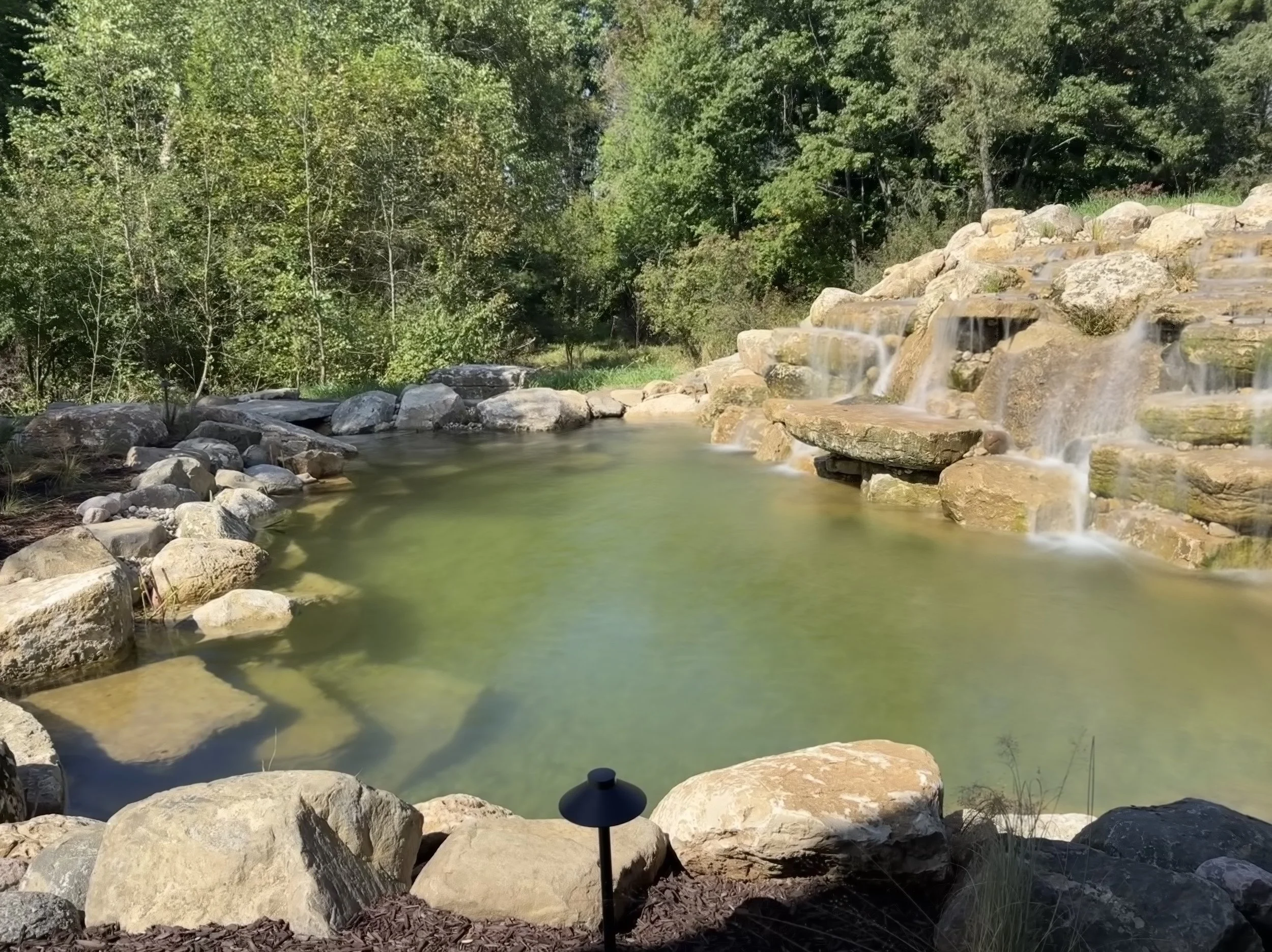 We selected certain trees to remove while making sure the homeowners had good views from their windows but also leaving enough trees to keep a private atmosphere. The swimming pond has a wetland filter and a large waterfall that faces directly at the house. We incorporated jumping rocks and plenty of unique places to sit and relax.