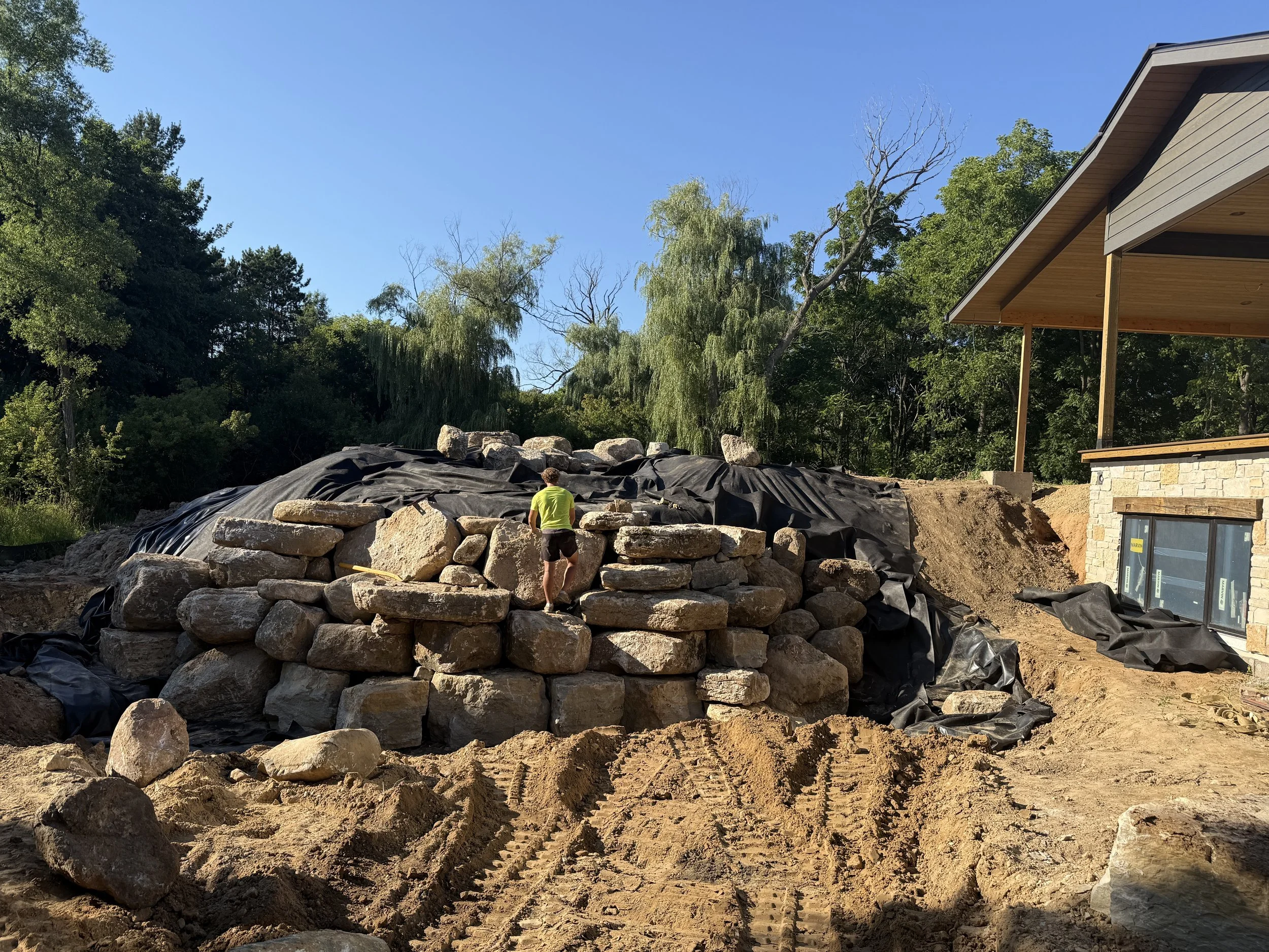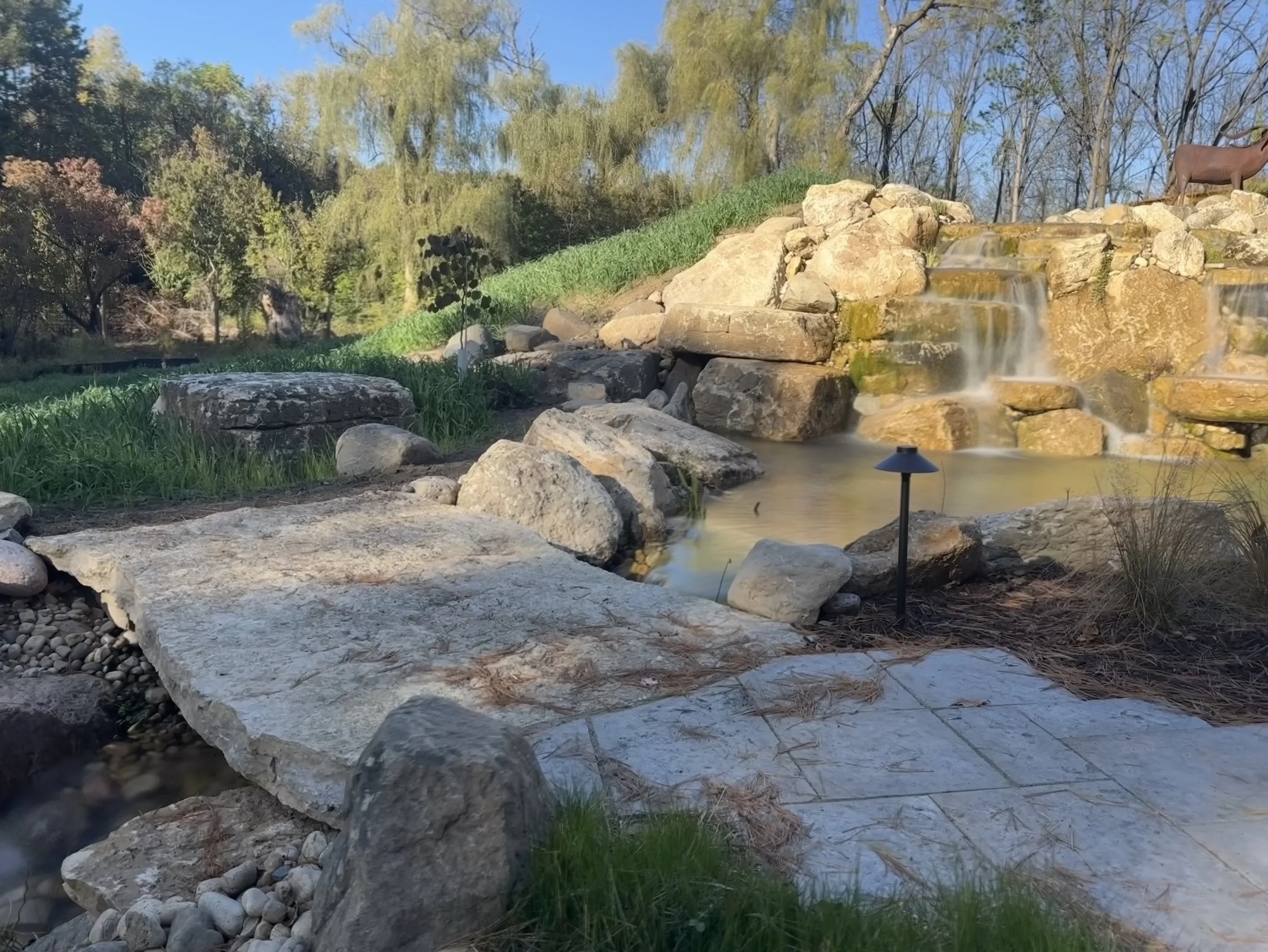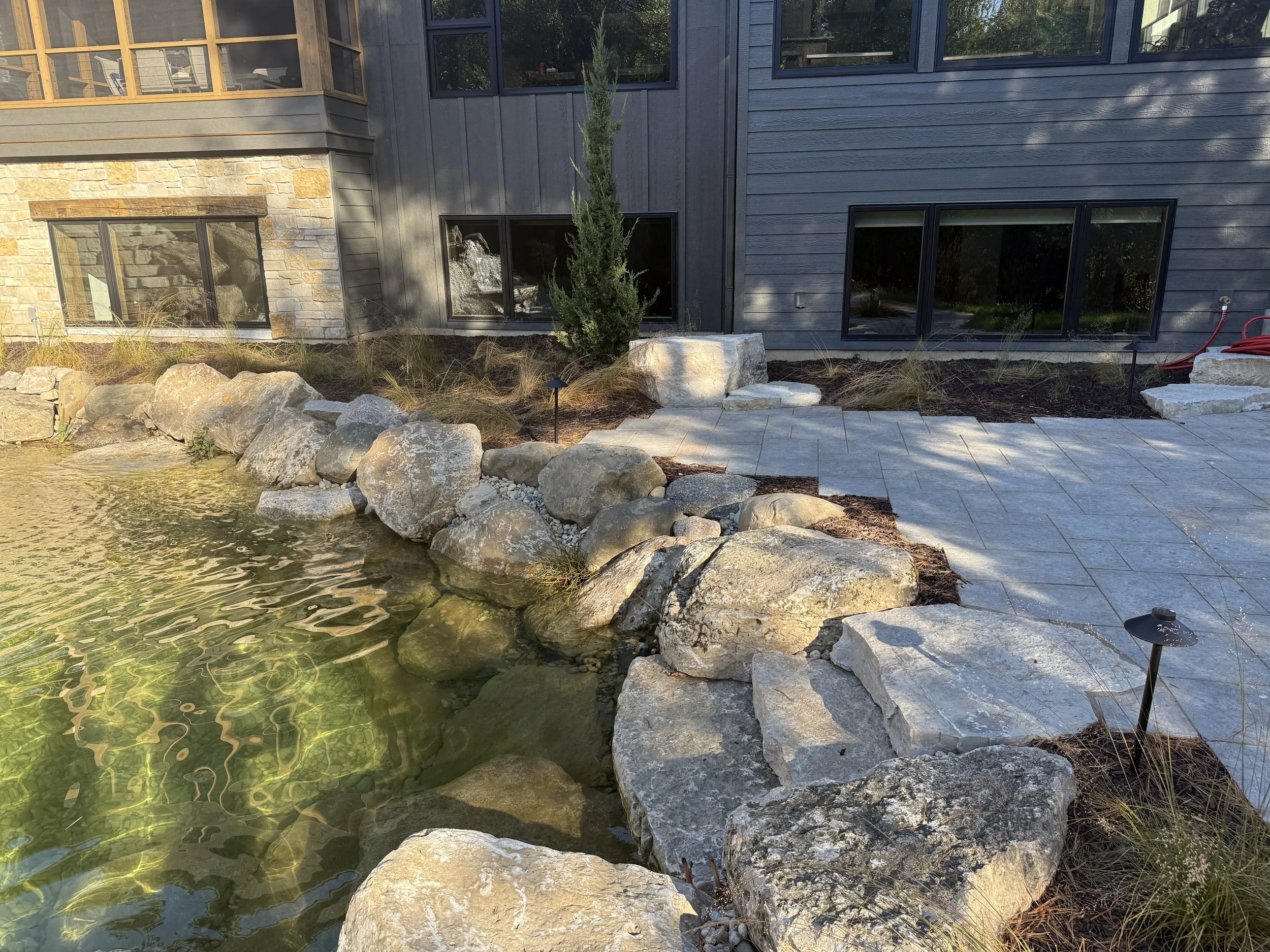 We built the landscape up to a 12-foot elevation, shaping the terrain to support a dramatic waterfall feature. One-ton-plus boulders were precisely placed using rock grapples and straps, creating a natural, timeless composition accented by concealed nighttime lighting. The pond incorporates a negative edge design with a reservoir for fluctuating groundwater conditions, including under-liner drain tile to manage subsurface water and ensure long-term performance.