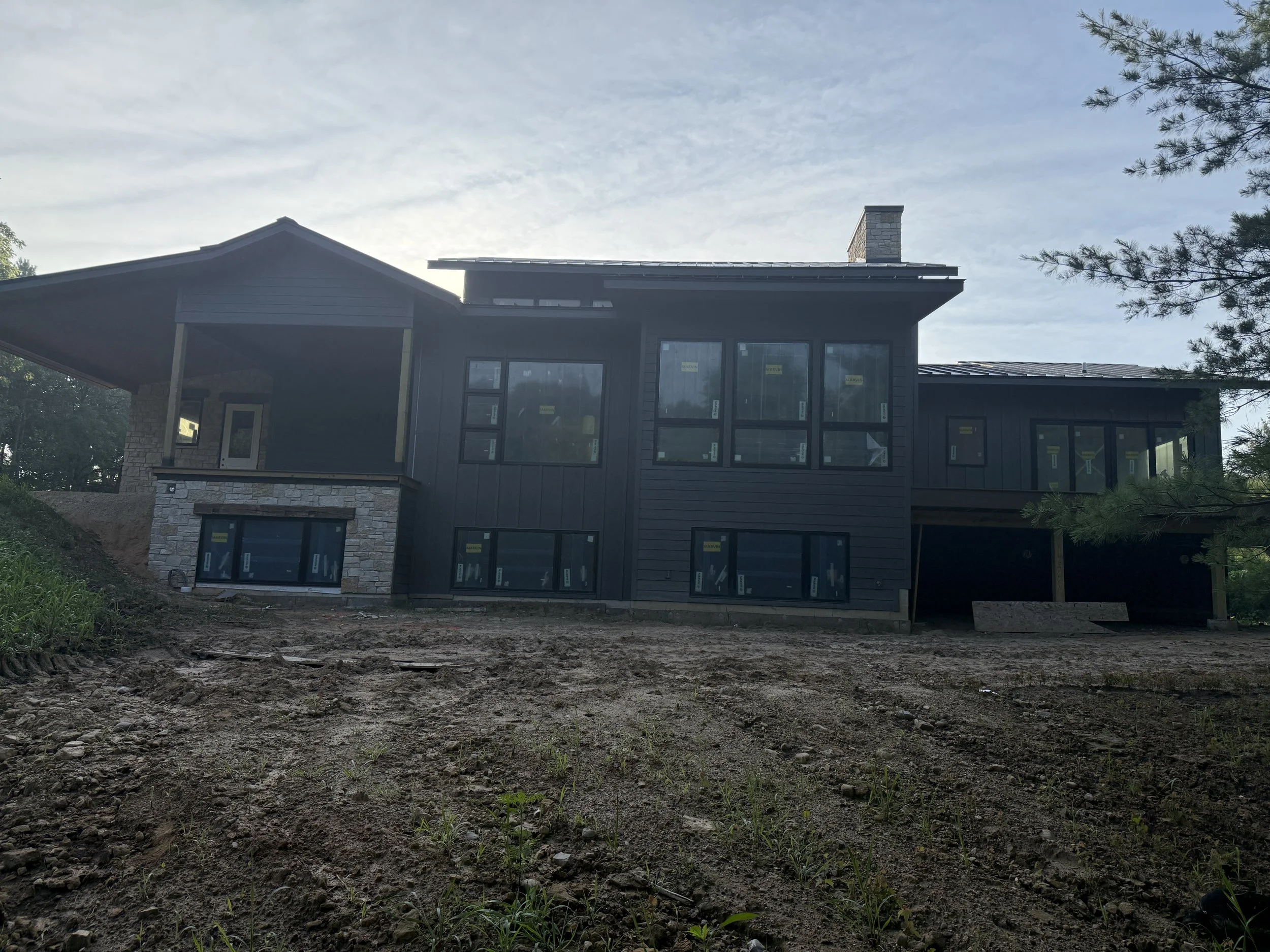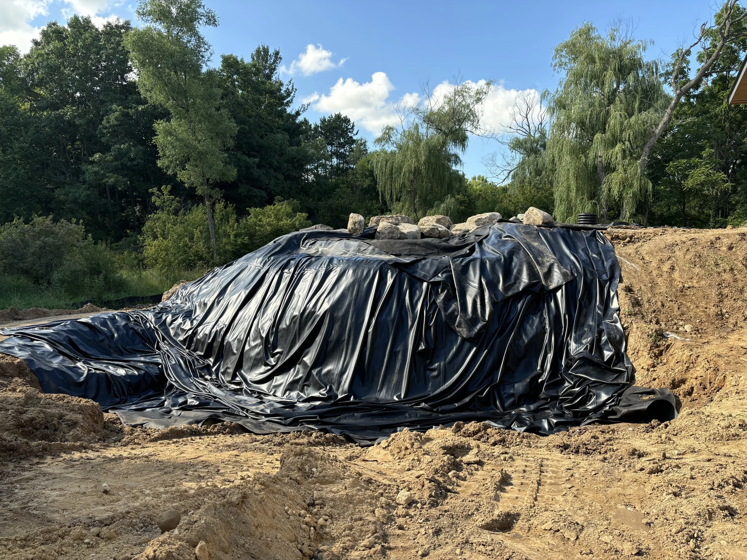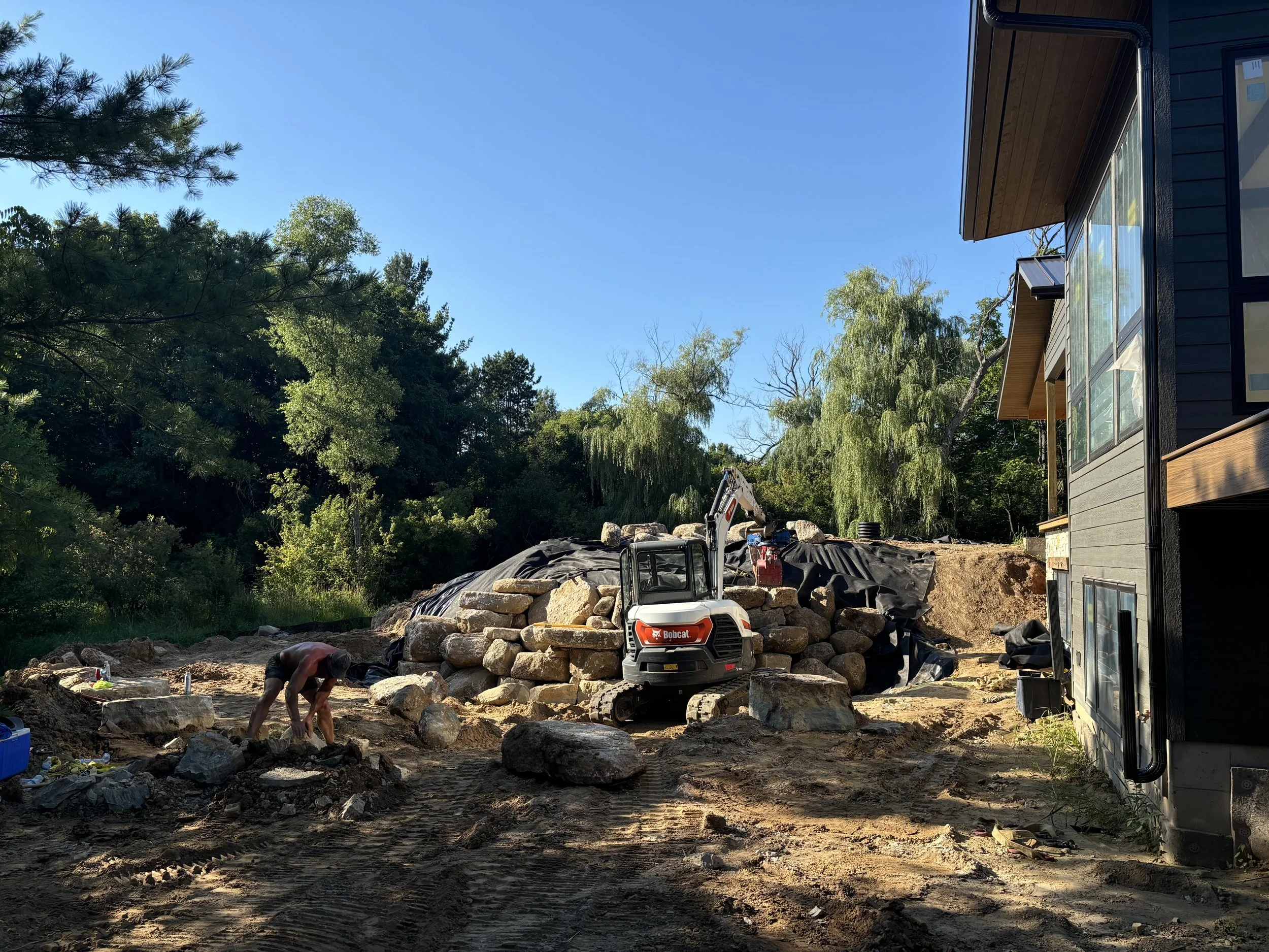 We built the landscape up to a 12-foot elevation, shaping the terrain to support a dramatic waterfall feature. One-ton-plus boulders were precisely placed using rock grapples and straps, creating a natural, timeless composition accented by concealed nighttime lighting. The pond incorporates a negative edge design with a reservoir for fluctuating groundwater conditions, including under-liner drain tile to manage subsurface water and ensure long-term performance.